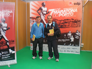 A minha equipa estava ali em peso, mas só 2 elementos é que iriam fazer a Maratona, eu e o Elísio Costa, o Costa que já andava afastado desta distância desde a Maratona do Portode 2008.De tal forma estava distraído que quando me apercebo já só faltava meia hora para o início da corrida. Já na viatura optei por calçar os ténis com que fiz a Maratona do Porto (já velhos e rôtos) que me fizeram sentir sempre muito bem durante toda a corrida, completada a tarefa sempre trabalhosa de proteger algumas zonas mais sensíveis e devidamente equipado vou para a zona de partida, ainda vou a meio do caminho e verifico que me falta ainda o dorsal, então voltei ao carro e resolvi o problema e corro para o local de partida, mas após os primeiros passos de corrida dou conta que ainda tenho os óculos colocados, volto novamente para trás, as coisas não estavam mesmo a correr bem. À entrada do Estádio (a partida era em plena pista) ainda tive tempo de me despedir da minha equipa que aguardava a hora de participarem na Meia Maratona.