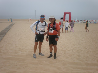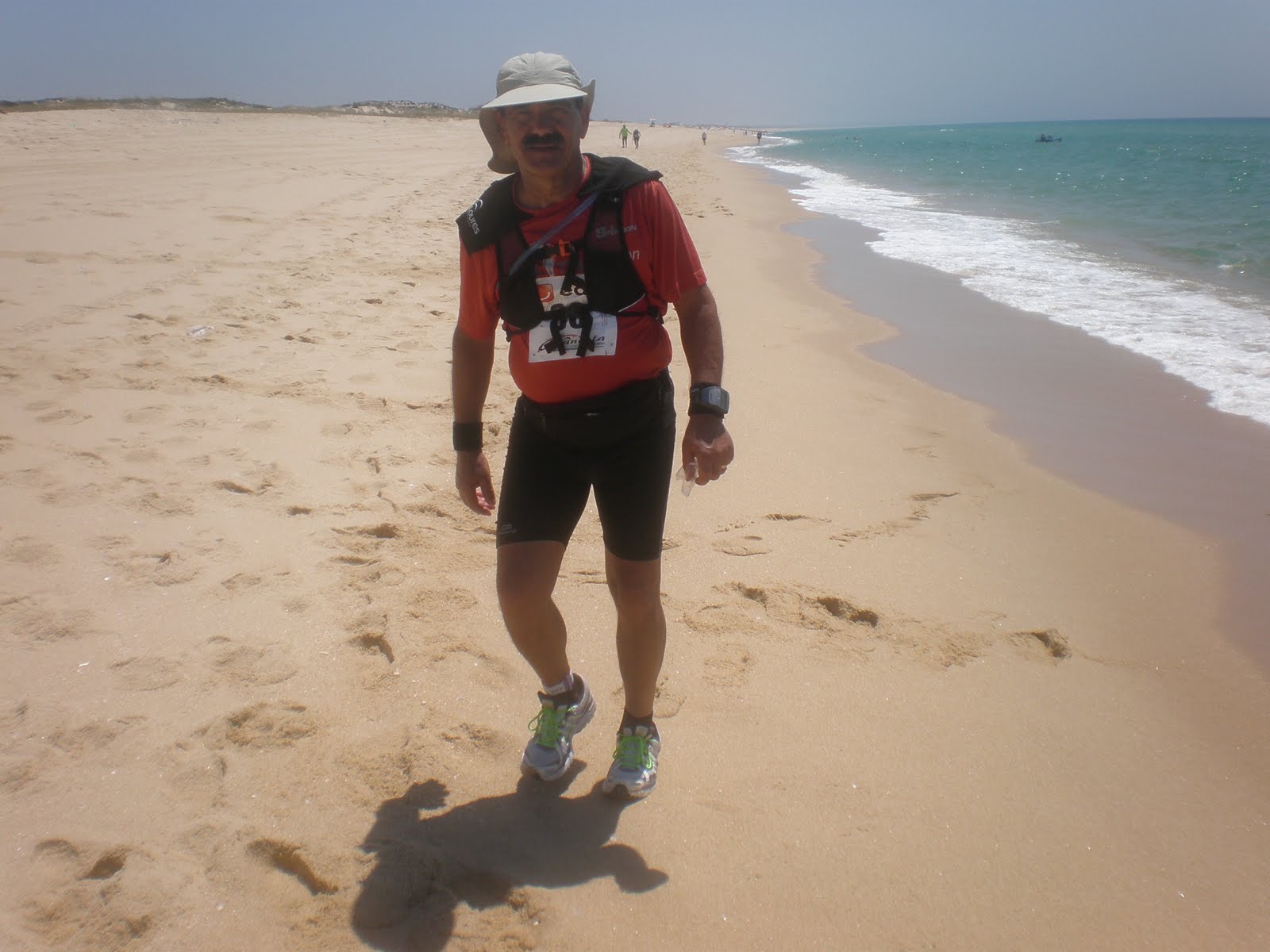 De repente aos 22 kms dou com o Daniel a caminhar à minha frente, tinha começado a andar 2 kms mais atrás e ia desistir disse-me ele, estava incapaz de correr, as ancas e os pés estavam insuportáveis e negou-se a continuar com aquele suplício, ainda tentei demovê-lo a acompanhar-me mas não consegui, seguiu ainda até aos 28,5 kms e apanhou boleia para o local de chegada. Apesar de estar com os mesmos sintomas que o Daniel e ainda com dores na zona dos rins não desanimei e prossegui, o piso ia ficando cada vez pior e sempre que a areia ia ficando demasiado mole eu tinha de andar, sempre dentro da rebentação e ainda com as Neoprene calçadas, tinha planeado tirá-las por volta dos 10 kms e agora tinha de alterar a ideia inicial, mas já estava a tornar-se insuportável a sua manutenção, não pelas meias mas sim pelas dores que já ia sentindo nos pés pela permanente inclinação da areia, (parecia que os dois pés estavam abertos ou como se diz com fratura de esforço) mas decido levá-las até ao único abastecimento que estava aos 28,5 kms. Perdi a noção do tempo gasto até chegar aqui, (levava o Garmin e desinteressei-me totalmente dele) mas sabia que o objectivo inicial das 6 horas estava em causa.