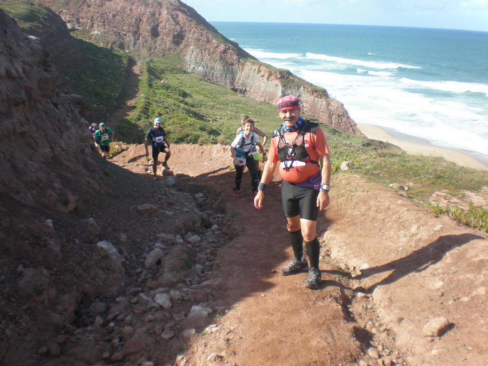 Escusado será dizer que fiz asneira mas quando parti sentia que a lesão podia ser gerida conforme a corrida se ia desenvolvendo, só que "esqueci" que ia fazer trail com terrenos agrestes onde não faltou muita pedra solta, rochas, mata, asfalto, areia e muito sobe e desce. Ao fim de 2 kms de prova começo a sentir a canela com dores ainda que ligeiras, nesta altura seguíamos pelas arribas junto ao mar na direcção Norte, seguia já nas últimas posições com 2 amigos, Mário Lima e Carlos Coelho. Quando passo de novo junto ao local de partida pelos 4kms tinha duas opções, ou ficava ali e aliviava a dor que já era intensa ou seguiria e iria passar as tormentas até chegar ao final, optei por seguir.