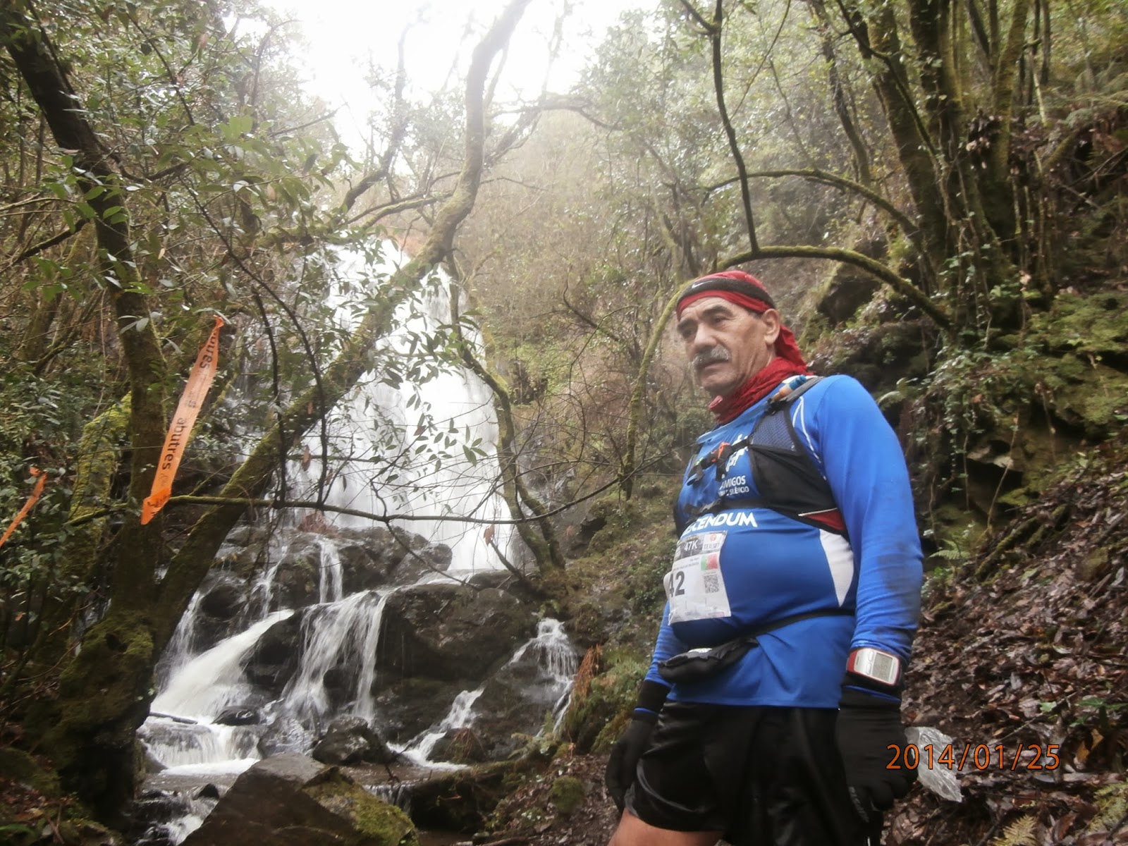 Esperava já o pior com a eliminação, o meu estado físico era já muito débil e por isso qualquer decisão era aceitável, não sei porquê a organização decidira dar mais uma hora, creio que por algum atraso na partida e também face ao estado do terreno nos tivessem facilitado a vida, seguramente se assim não fosse perto de 20 atletas não teriam prosseguido em prova. Do mesmo modo sou informado que em Gondramaz seria também cedido mais uma hora para lá chegar, passariam a 10h. Pouco nada comi ali, o estomago como é habitual chega a uma altura pouco tolera em relação a alimentos, mesmo assim forço a banana, laranja e marmelada, muito pouco para as necessidades mas foi o que consegui. Encho de novo o kamelback e sigo viagem, pensando eu que iria encontrar o caminho mais fácil até chegar ao ponto mais alto deste trail (aliás como acontecera em 2012), mas não, novo rio e as mesmas dificuldades, o nevoeiro continuava, a visibilidade era agora mais difícil, o arvoredo era imenso, o caudal deste rio era forte e as pontes improvisadas serviam de passagem de um lado para o outro por forma a permitir a nossa progressão serra acima, as fitas de sinalização cor de tijolo nada ajudam, passam quase despercebidas, valeu-nos algumas vezes as autênticas avenidas que os atletas da frente iam deixando com a sua passagem, agora já percebia porque é que a organização nos concedeu 4 h para fazer apenas 12 kms de prova, ouve alturas de tanto serpentear com subidas e descidas íngremes, com quedas à mistura, uma delas de cabeça a baixo, me sentia sem forças para continuar mas ali não havia espaço para parar, trazia por perto mais dois atletas e isso deu-me alguma confiança quanto aos riscos que íamos correndo a cada instante, as cascatas impressionantes iam aparecendo, isto representava mais um esforço suplementar para prosseguir mas aquilo que os nossos olhos viam sempre nos dava outro alento para vencer aquela batalha,