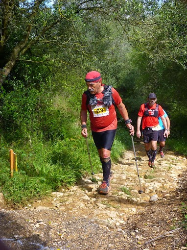 tanta falta me iria fazer nos kms seguintes. Nova brutal subida se aproxima, vai aos 850 metros com inclinações muito duras de fazer, o sol e a ausência de força torna penoso o avanço e caminho cada vez mais devagar, apesar das dificuldades abandonar estava fora de questão, depois de chegar ao alto desta serra tento correr um pouco num terreno mais acessível mas não consigo, queria agora chegar ao posto de abastecimento de Carreiras e descansar um pouco para depois prosseguir, cheguei, larguei a mercadoria e deitei-me em cima das tábuas de um banco de jardim!!! Depois apareceram os Bombeiros...