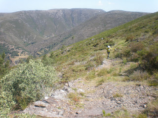 No abastecimento dos 30 kms conto novamente com a companhia do Fernando Andrade que chega bastante desgastado , eu próprio também não estava melhor, ouve ali um amigo que nos deu um pouco de sal refinado que nos fez reactivar novamente os índeces de motivação para prosseguir, segui com o Fernando prontos para enfrentar mais uma montanha que estava logo ali à nossa frente que até doía a vista só de olhar lá para cima, dali conseguíamos ver alguns atletas que já iam lá no cimo, pareciam formigas, mas a nossa motivação ainda estava em alta, antes de começar a subir ainda descemos mais um pouco ao longo de mais um Rio de água quase cristalina onde o Fernando aproveitou para se refrescar mais um pouco, eu segui e comecei a subir aquela montanha sem saber como é que o iria conseguir, (em 1.800m. subimos dos 600m para os 1.100m. de altitude), o Sol estava escaldante, de frente para nós enquanto subíamos, não havia trilhos, o percurso era balizado por pequenas fitas que nos íam guiando, por vezes era um pé à frente e outro atrás, as forças já eram poucas, os pés escaldavam e doíam, é nesta fase que recebo uma chamada providêncial da minha filha Susana, eu quase que não podia falar tal era o cansaço, mas foi um grande estímulo pois estava quase a chegar ao cumee deu para descansar um pouco, entretanto olho para trás e vejo o Fernando a aproximar-se de mim, sinal que a moral está de novo em cima, atrás dele perde-se um vale imenso quase a perder de vista, pouco depois chego à estrada que nos levará até ás Eólicas, ponto mais alto da Serra. Antes de lá chegar ainda conseguimos correr cerca de 1km (já estávamos com saudades) mas foi penoso ter de fazê-lo pois o limite de tempo para chegar a mais um controlo de eleminação estava aos 40kms e só "tínhamos" 45 minutos para fazer os restantes 2,5kms. Mas a surpresa estava para vir, quando pensávamos que a meta estava ali num percurso acessível eis-nos atirados para o triho dos Íncas, que não era mais do que descer novamente a mesma Serra que tínhamos subido e depois circular a Serra por um caminho espectacular mas cheio de obstáculos, mato rasteiro que nos deixou as pernas arrasadas, caminhar em cima de lages, em alguns locais à beira de precepícios até que surge a povoação e o consequente controlo e abastecimento. Aqueles 2,5kms foram percorridos em 1,15h, chegámos com o controlo encerrado à cerca de 30 minutos. Acabava ali o sonho de atingir o objectivo que sonhava. Antes de lá chegar já tinha dicidido com o Fernando que não iríamos prosseguir, aquilo não está acessivel a qualquer um, a limitação de tempos de passagem em cada etapa elimina à partida qualquer veleidade de voltar a tentar, a menos que os prazos sejam alargados. Para mim acabou-se.